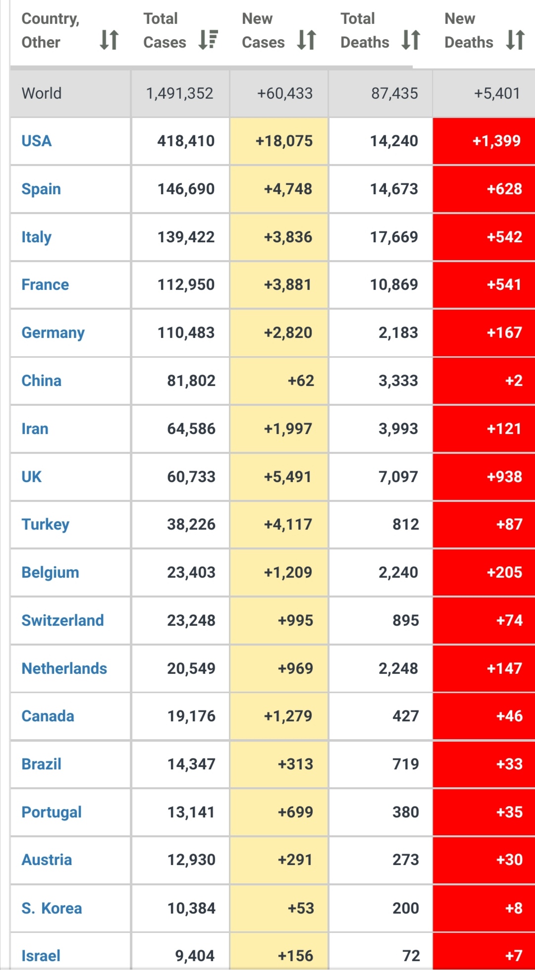 सबैभन्दा बढि संक्रमण फैलिएको अमेरिकामा कुल संक्रमितको संख्या ४ लाख १८ हजार पुगेको छ । त्यस्तै एकदिनमै अमेरिकामा १८ हजार जनामा कोरोना संक्रमण भएको पुष्टि भएको छ भने बुधबार मात्रै १३ सय ९९ जनाको मृत्यु भएको छ । बुधबार अमेरिकामा सबैभन्दा धेरैको मृृृत्युु भएको हो ।