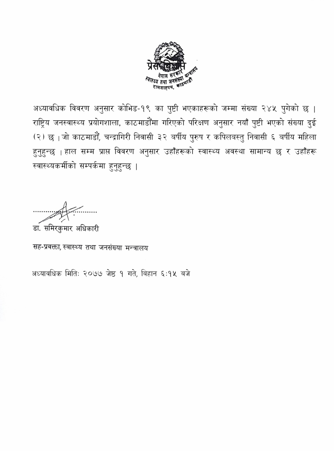 काठमाडौं, जेठ १ । नेपालमा कोरोना संक्रमितको संख्या दुई सय ४५ पुगेको छ। बिहीबार थप दुई जनामा कोरोना भाइरस पुष्टि संगै सर्तकता समेत बढाइने भएको छ । स्वास्थ्य तथा जनसंख्या मन्त्रालयका अनुसार राष्ट्रिय जनस्वास्थ्य प्रयोगशाला, काठमाडौंमा गरिएको परीक्षणमा दुई नयाँ संक्रमित फेला परेका हुन् ।