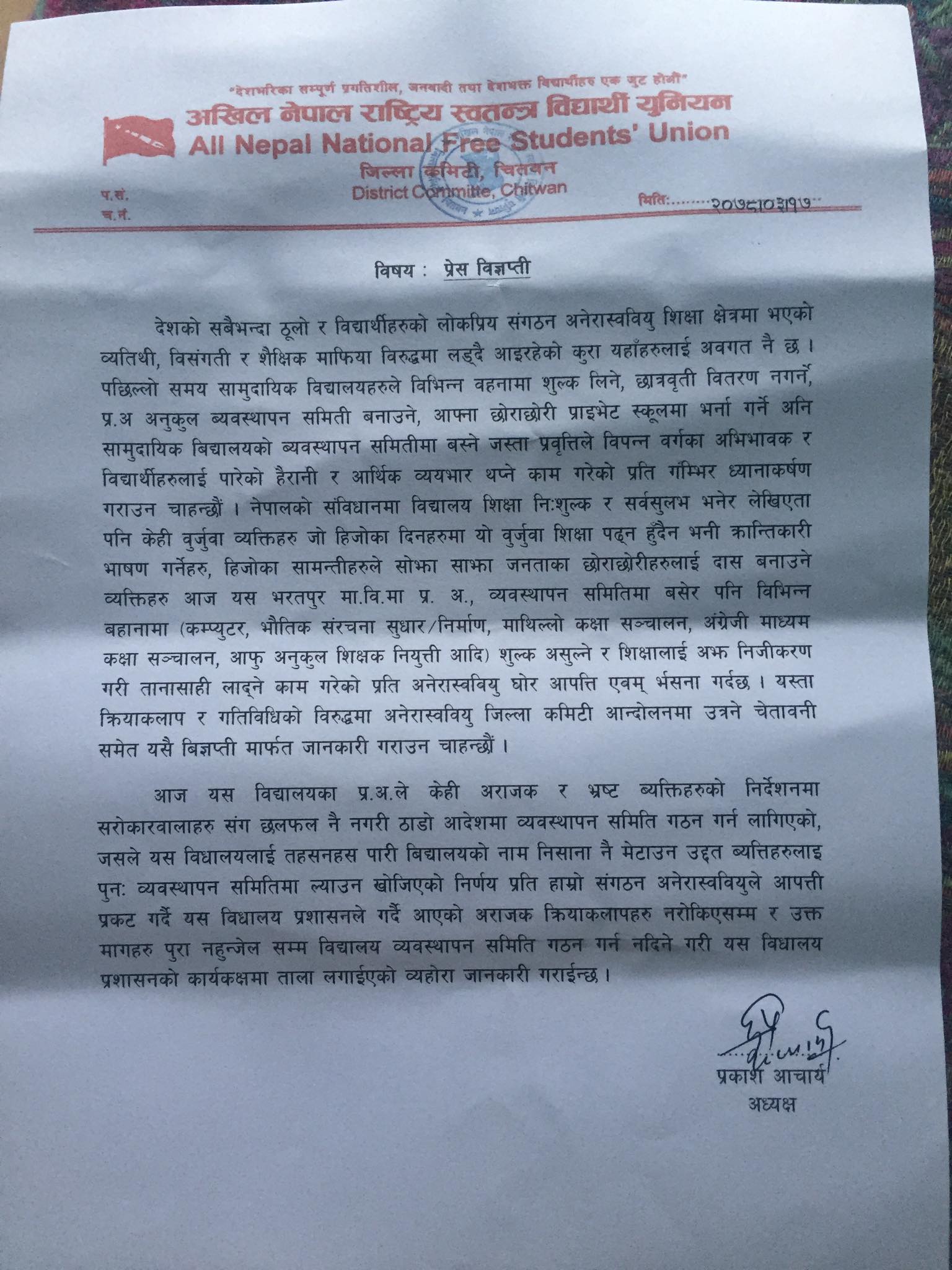 अखिल नेपाल राष्ट्रिय स्वतन्त्र विद्यार्थी युनियन (अनेरास्ववियु) जिल्ला कमिटी चितवनका अध्यक्ष प्रकाश आचार्यले आज एक विज्ञप्ति जारी गर्दै आपत्ती प्रकट गरेका हुन् ।
