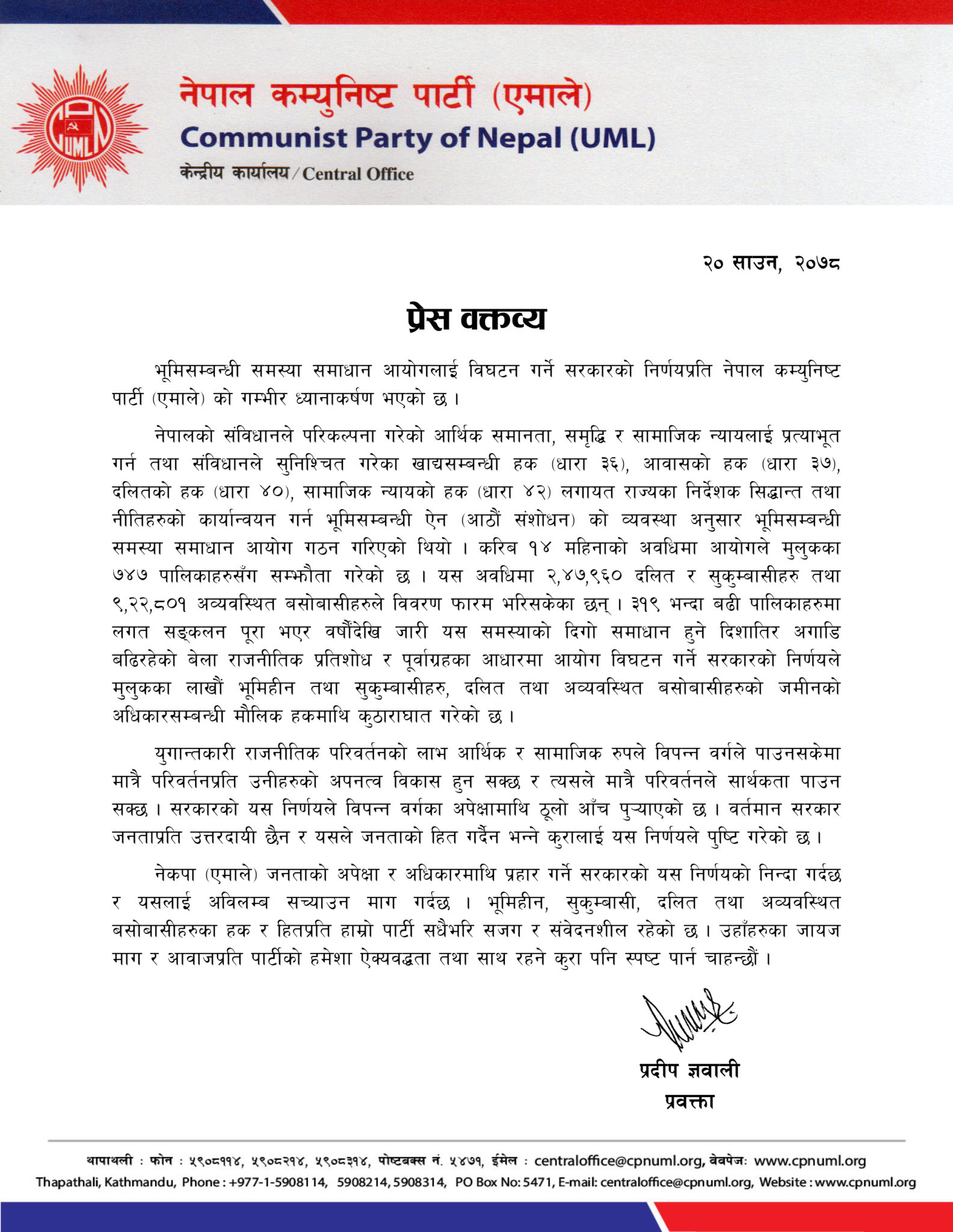 ३१९ भन्दा बढी पालिकाहरुमा लगत सङ्कलन पूरा भएर वर्षौंदेखि जारी समस्याको दिगो समाधान हुने दिशातिर सरकार अगाडि बढिरहेको बेला राजनीतिक प्रतिशोध र पूर्वाग्रहका आधारमा आयोग विघटन गर्ने सरकारको निर्णयले मुलुकका लाखौं भूमिहीन तथा सुकुम्बासीहरू, दलित तथा अव्यवस्थित बसोबासीहरुको जमीनको अधिकारसम्बन्धी मौलिक हकमाथि कुठाराघात गरेको छ, प्रवक्ता ज्ञवालीले जारी गरेको विज्ञप्तिमा उल्लेख छ ।