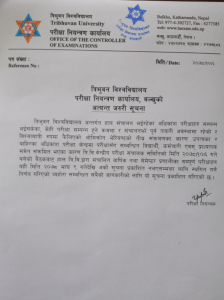 त्रिविको सूचनामा भनिएको छ, ‘हाल सञ्चालन भइरहेका अधिकांश परीक्षाहरु सम्पन्न भइसकेका, केही परीक्षा सम्पन्न हुने क्रममा र सञ्चालनको पूर्वतयारी अवस्थामा रहेको र विश्व्यापी रुपमा फैलिएको ओमक्रोम भेरियन्तको तीव्र संक्रमणका कारण उपत्यका र बाहिरका अधिकांश परीक्षा केन्द्रमा परीक्षासँग सम्बन्धित विद्यार्थी, कर्मचारी एवम् प्राध्यापकसमेत संक्रमित भएका कारण त्रिवि केन्द्रीय परीक्षा सञ्चालन समितिको बैठकबाट हाल सञ्चालित वार्षिक तथा सेमेस्टर प्रणालीका सम्पूर्ण परीक्षाहरु माघ ९ गतेदेखि अर्को सूचना प्रकाशित नभएसम्मका लागि स्थगित गर्ने निर्णय भएको छ ।’