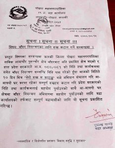 वडाध्यक्ष पाण्डेले जारी गरेको सूचनामा भनिएको छ। ‘पोखरा महानगरपालिका साविक लामाचौर पुरुन्चौर क्षेत्र बाँदरबाट अति प्रभावित क्षेत्र भएको र हाल प्रदेश सरकारले पनि बाँदर नियन्त्रणको नीति पास गरेको हुँदा आजको मितिले १० दिनभित्र ‘मेरो रुख म काट्छु’ भन्ने अभियान सञ्चालन गरी आआफ्नो घर वरपर रहेका सम्पूर्ण रुखहरु कटान गरी बाँदर नियन्त्रण अभियानमा सहयोग पुर्याउन अनुरोध गरिन्छ।’