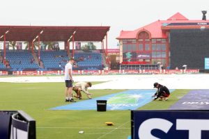 मैदानको आउटफिल्डमा पानी जमेको थियो। मुख्य पीच छोपिए पनि रनिङ क्षेत्र वर्षातका कारण भिजेको थियो।